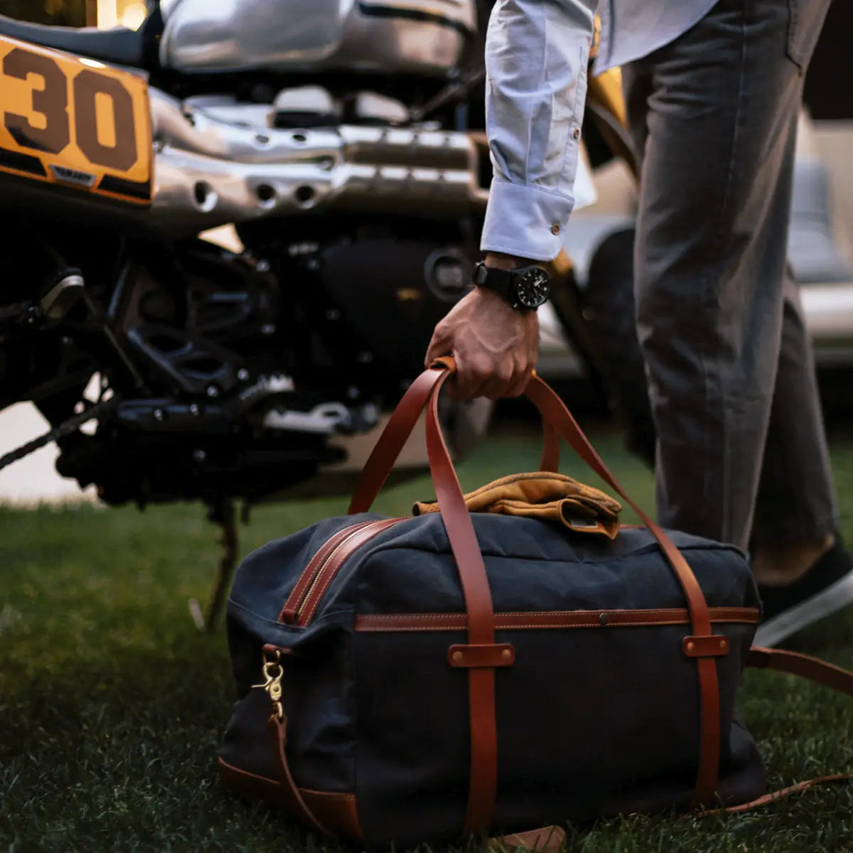 Inspired by 19th-century sailor suitcases, this 18oZ waxed fabric and leather weekender is a product that will last a lifetime. A sustainable investment that will only improve over time, thanks mainly to the Vegetable Tanned Leather and its 18oZ Waxed Fabric. The same fabric was used by Scottish sailors in 1850 on their voyages to protect themselves from winds and storms. An organic cotton fabric impregnated with beeswax gives it unique qualities, including waterproofing. Its fittings are made of pure brass, like those of ships, and its hammered copper rivets, making it practically unbreakable.