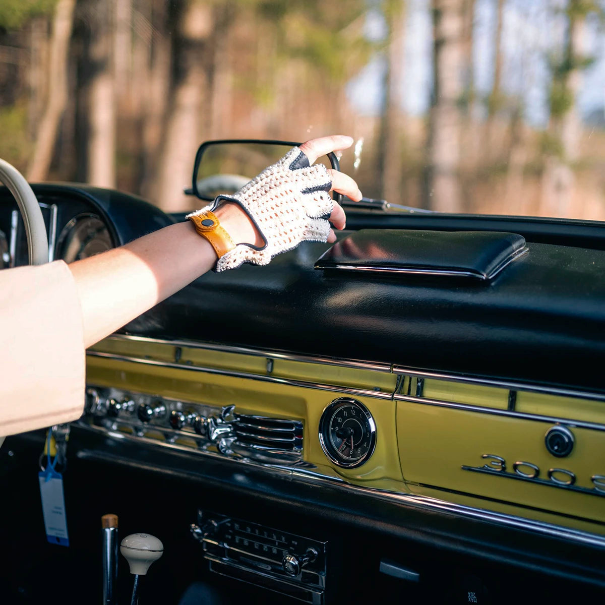 Crochet, handwoven with cotton thread, appeared in gloves at the end of the 19th century. Light, breathable, and flexible, it offered a clear advantage over other materials: it kept hands cool on warm days without sacrificing grip. The first models were common at rallies and classic car gatherings, where style was just as important as skill on the road.