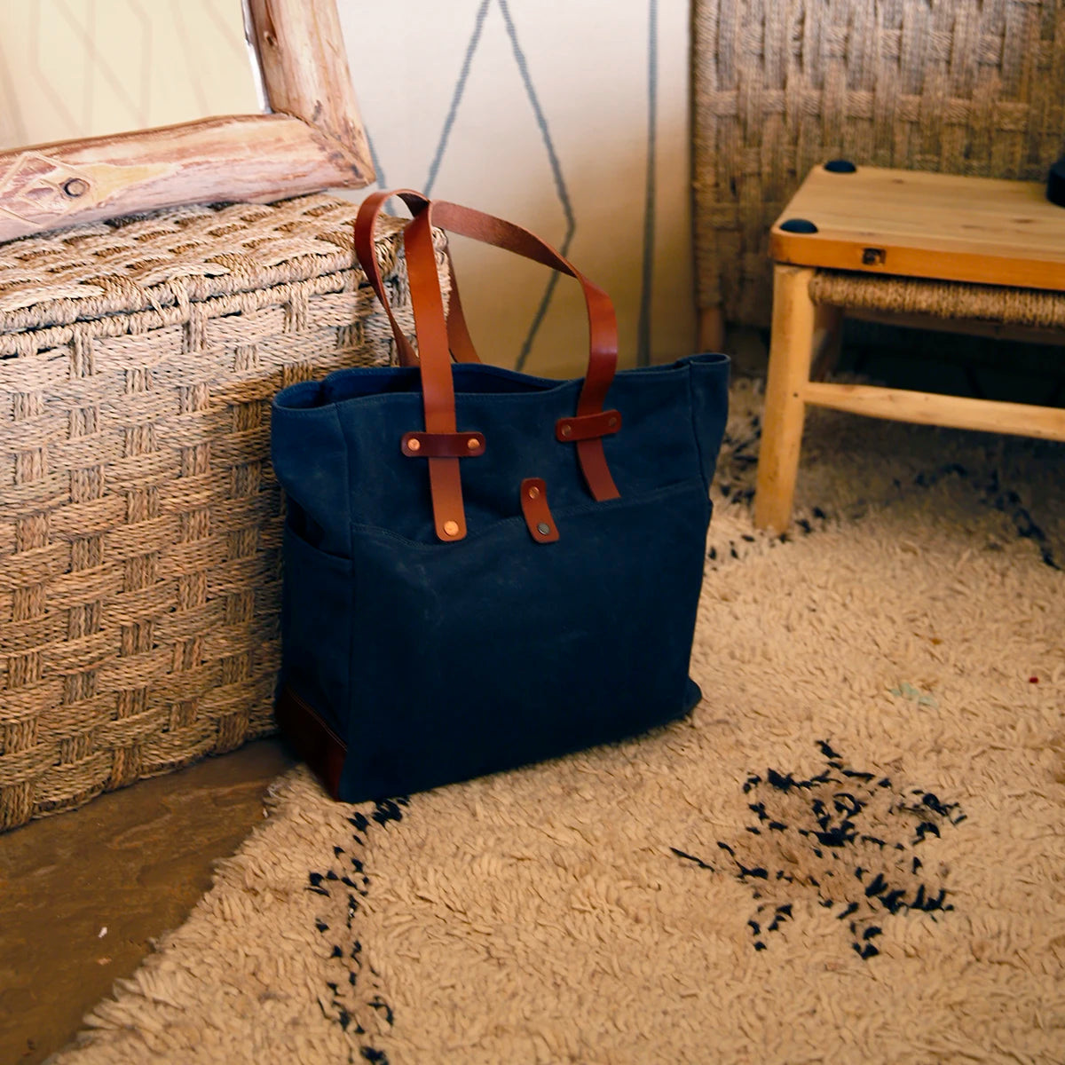 Inspired by the work tote bags from the XIX century, this waxed canvas and leather tote bag is a product that will last a lifetime. A sustainable investment that will only improve over time thanks to the Vegetable Tanned Leather and its Waxed 18oZ Canvas. The same fabric that Scottish sailors used in the 15th century to protect themselves from the winds and storms. Organic cotton fabric impregnated with beeswax gives it unique qualities, among others, waterproofing. The hardware is made of solid brass and hammered copper rivets, making it practically unbreakable.