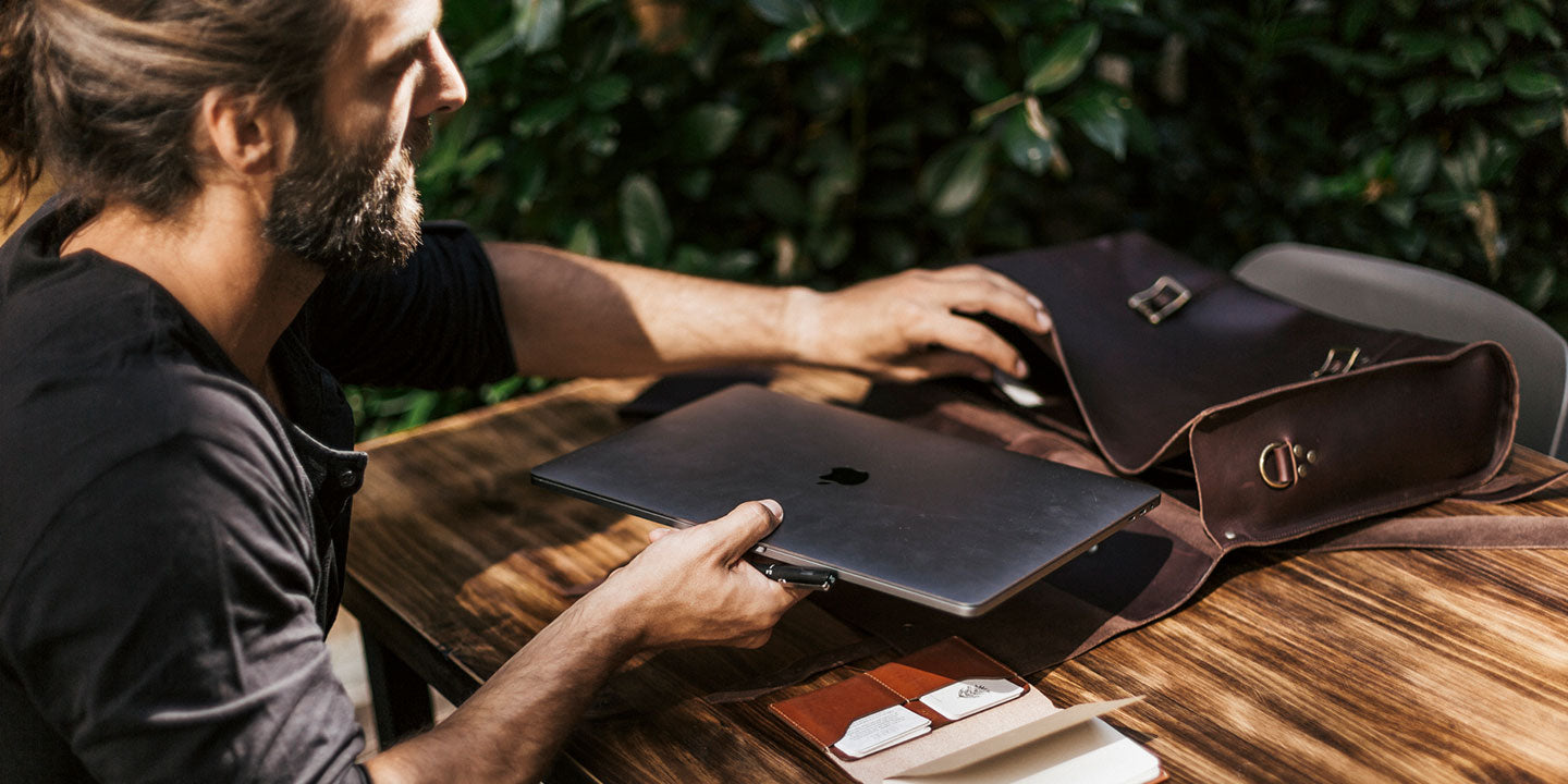 Consta de tres compartimentos: un amplio espacio principal donde guardar los objetos más voluminosos; un bolsillo para un portátil de hasta 15″; y diferentes compartimentos para almacenar dispositivos, tarjetas de visita, bolígrafos y otros objetos. La piel de este maletín ha sido cortada a mano y lijada para redondear los cantos.